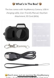 The box comes with: KeyMemory Camera. USB-A charging cable. User-friendly Manual. Keychain Attachment. SD Card (8Gb).
